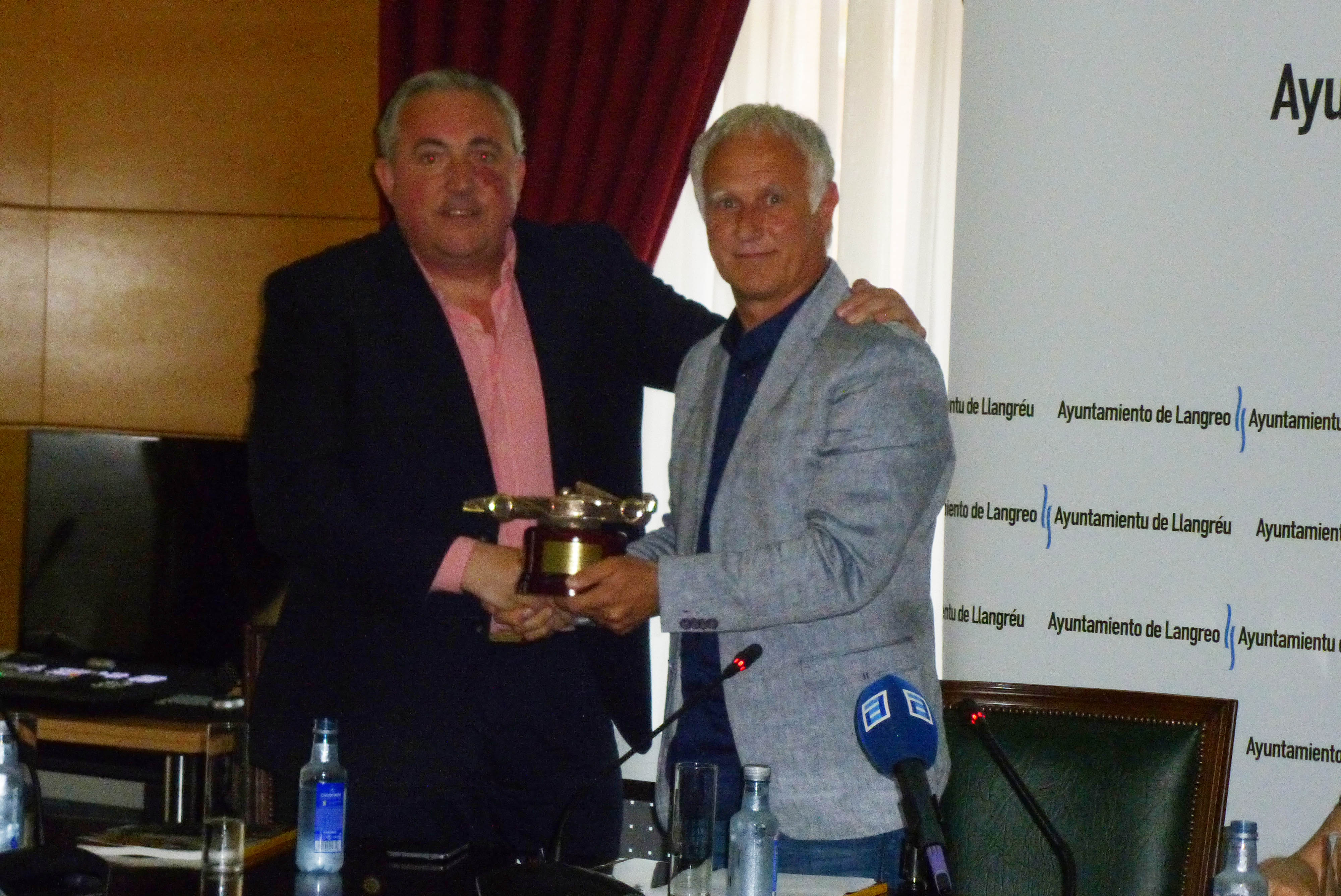 A continuación, 'Sasi' Pardeiro procedió a hacer entrega del Trofeo Institucional del Langreo Motor Club a Francisco Gutiérrez, gerente de Guttrans S.L., empresa a la que se ha otorgado este año el galardón por su continuado apoyo a la subida a Santo Emiliano.